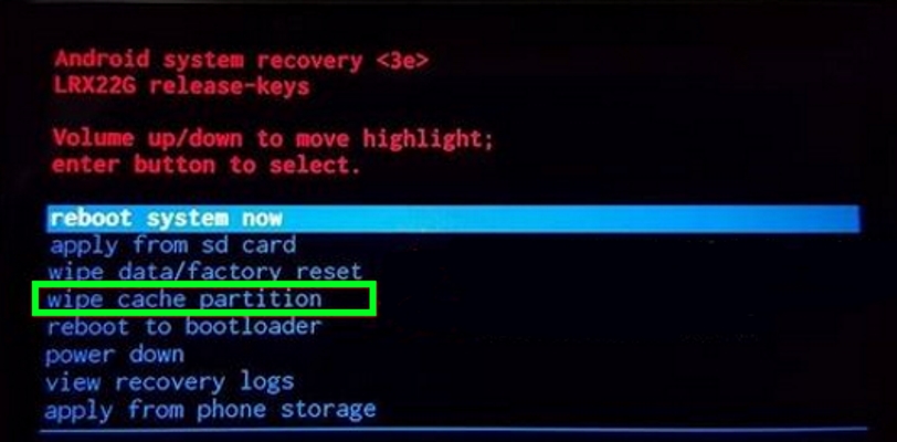 • Pressionando a tecla de volume para baixo, você tem que mover para “limpar a partição de cache