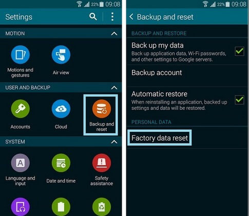 • Primeiro, vá para Configurações e depois opção “Backup e Redefinir