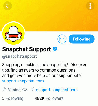 Muitas vezes, o problema é do lado do Snapchat, onde o servidor trava ou algo dá errado. Se este for o problema, você pode obter as informações sobre ele no Twitter. Você precisa acessar a conta do Twitter do Snapchat (@snapchatsupport) e obter as informações se houver um erro do lado do servidor.