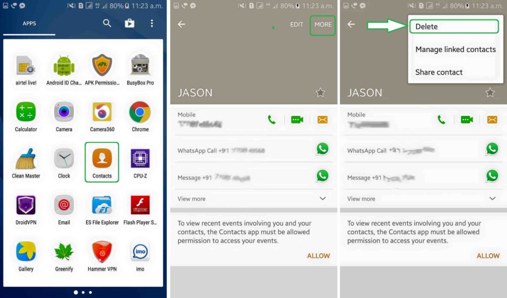 Depois de obter esse nome, marque-o e escolha a opção para excluí-lo, selecionando a opção Excluir. Isso removerá completamente o número de telefone do seu telefone. Além disso, verifique se o número não está salvo no cartão SIM. Isso garantirá que o contato específico seja removido do telefone e, esperançosamente, do WhatsApp também.