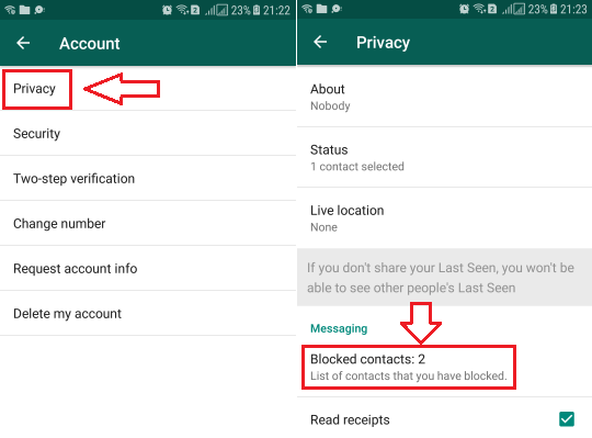 Quando você entra na opção Privacidade, pode ver a opção “Bloqueado“. Depois de clicar nele, você verá uma lista completa de contatos bloqueados que você fez até agora. aqui, os contatos que você excluiu da lista de contatos do telefone também aparecerão, mas sem nomes. Você só pode ver o número dessas pessoas na seção bloqueada.