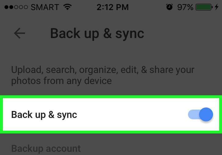 - Se você não quiser o recurso de sincronização automática, desative-o abrindo o aplicativo Google Fotos> escolha Menu> Configurações> Backup e sincronização e aí você pode ligar ou desligar.