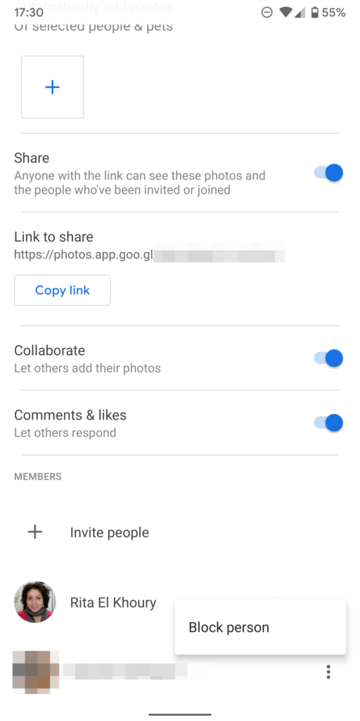 Existem outras opções de compartilhamento, como simplesmente clicar no botão Obter link para obter um URL exclusivo para as fotos selecionadas e colá-lo em um texto, e-mail e outra mensagem. Lembre-se de que o URL não é para uma pessoa em particular para quem você envia, portanto, qualquer pessoa pode ver o URL das fotos com link. Mas você pode parar com isso a qualquer momento.
