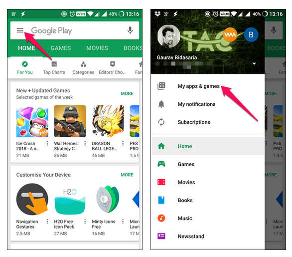 Primeiro, vá para a Play Store> clique no ícone Menu e toque na opção Meus aplicativos e jogos.