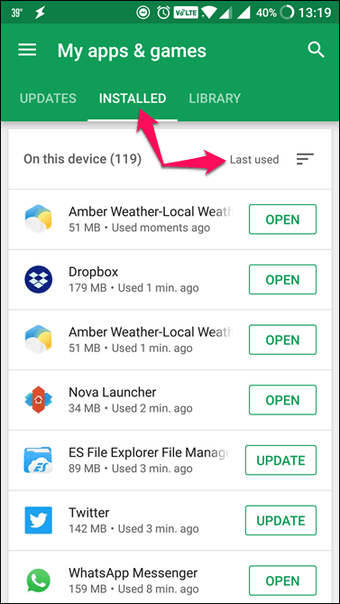 Selecione a guia Instalado, onde você pode selecionar aplicativos de um pedido diferente. Mas você precisa ver os aplicativos instalados recentemente, então toque no botão Classificar e escolha a opção Última utilização.