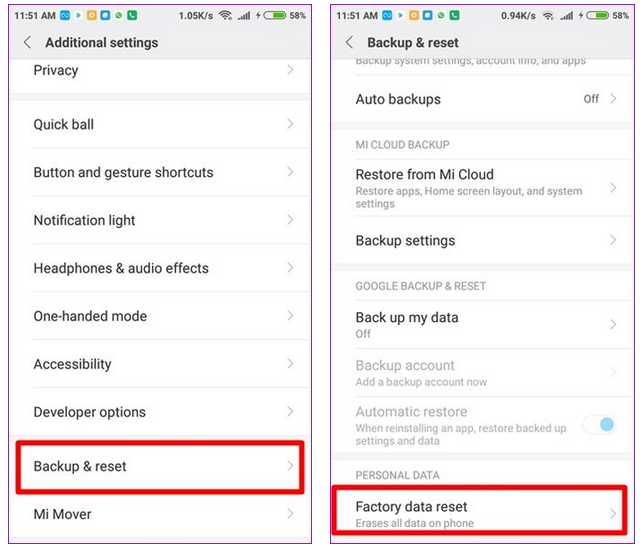 Finalmente, quando nada funciona para você, então é hora de ir duro agora. Para isso, você tem que formatar o seu dispositivo, mas lembre-se de fazer um backup dele. Depois disso, siga as etapas abaixo para fazer a redefinição de fábrica: