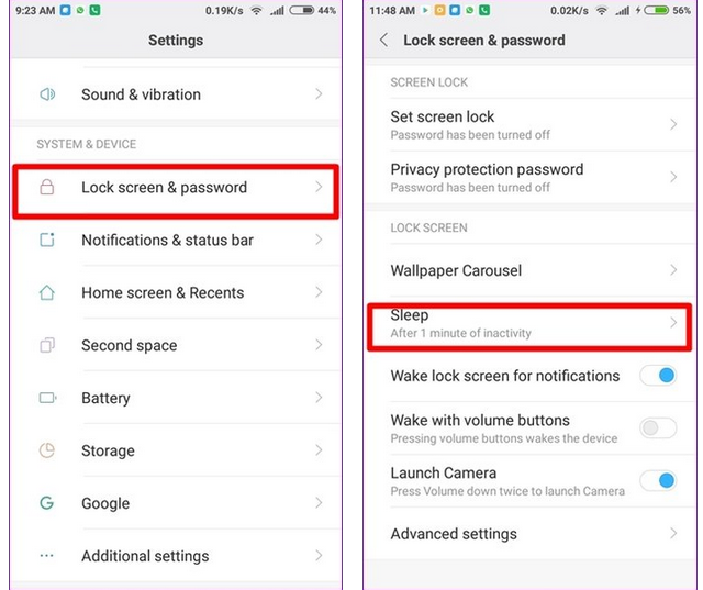 Por isso, seria melhor manter o tempo de sono de 30 segundos a 1 minuto e não mais do que isso. Para alterar o tempo de inatividade, você precisa ir para Configurações> clique em Bloquear tela e senhas e, depois disso, clique na Opção de sono e selecione a hora preferida.